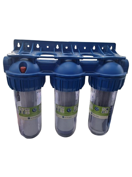 три корпуса 10″, свързани чрез нипели, монтажна плоча, гаечен ключ за отвиване на корпусите, PP филтър от 5 микрона, филтър от карбонов блок, филтър от гранулиран карбон.